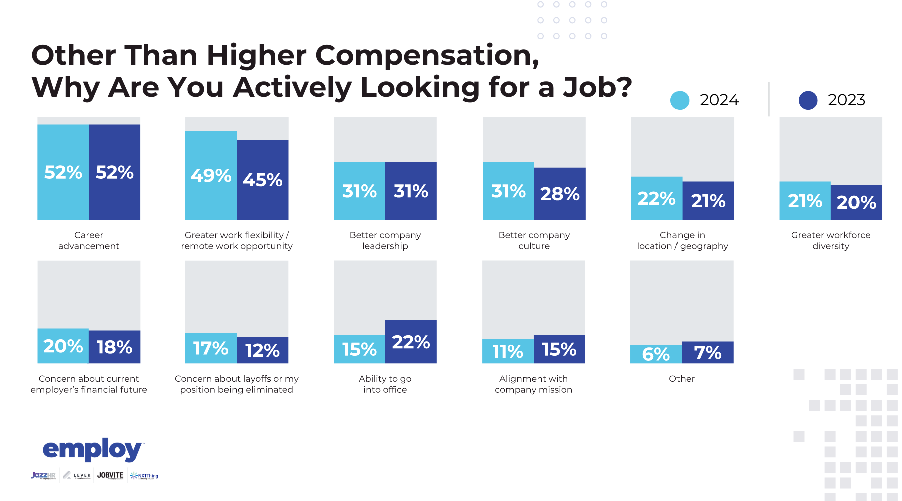 Sebagian besar pekerja di AS saat ini aktif mencari pekerjaan baru, dengan 4 dari 10 pekerja mengatakan mereka sedang mencari pekerjaan baru. Namun apa yang memotivasi pencari kerja untuk mencari pekerjaan baru? Selain kompensasi, pencari kerja aktif terutama termotivasi oleh kemajuan karier, peningkatan fleksibilitas kerja, atau kesempatan untuk bekerja dari jarak jauh.