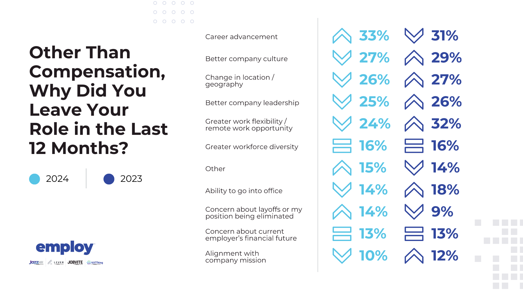 Lebih dari satu dari lima pekerja (22%) akan meninggalkan pekerjaannya antara tahun 2022 dan 2023. Selama 12 bulan terakhir, angka ini turun menjadi hanya 17%. Selain mencari kompensasi yang lebih besar, karyawan juga cenderung menginginkan peningkatan karier (33%), budaya perusahaan yang lebih baik (27%), perubahan lokasi atau geografi (26%), kepemimpinan perusahaan yang lebih baik (25%), dan kepuasan kerja. Mereka menjawab bahwa mereka berhenti dari pekerjaannya saat ini karena peningkatan volume. Fleksibilitas/peluang kerja jarak jauh (24%).